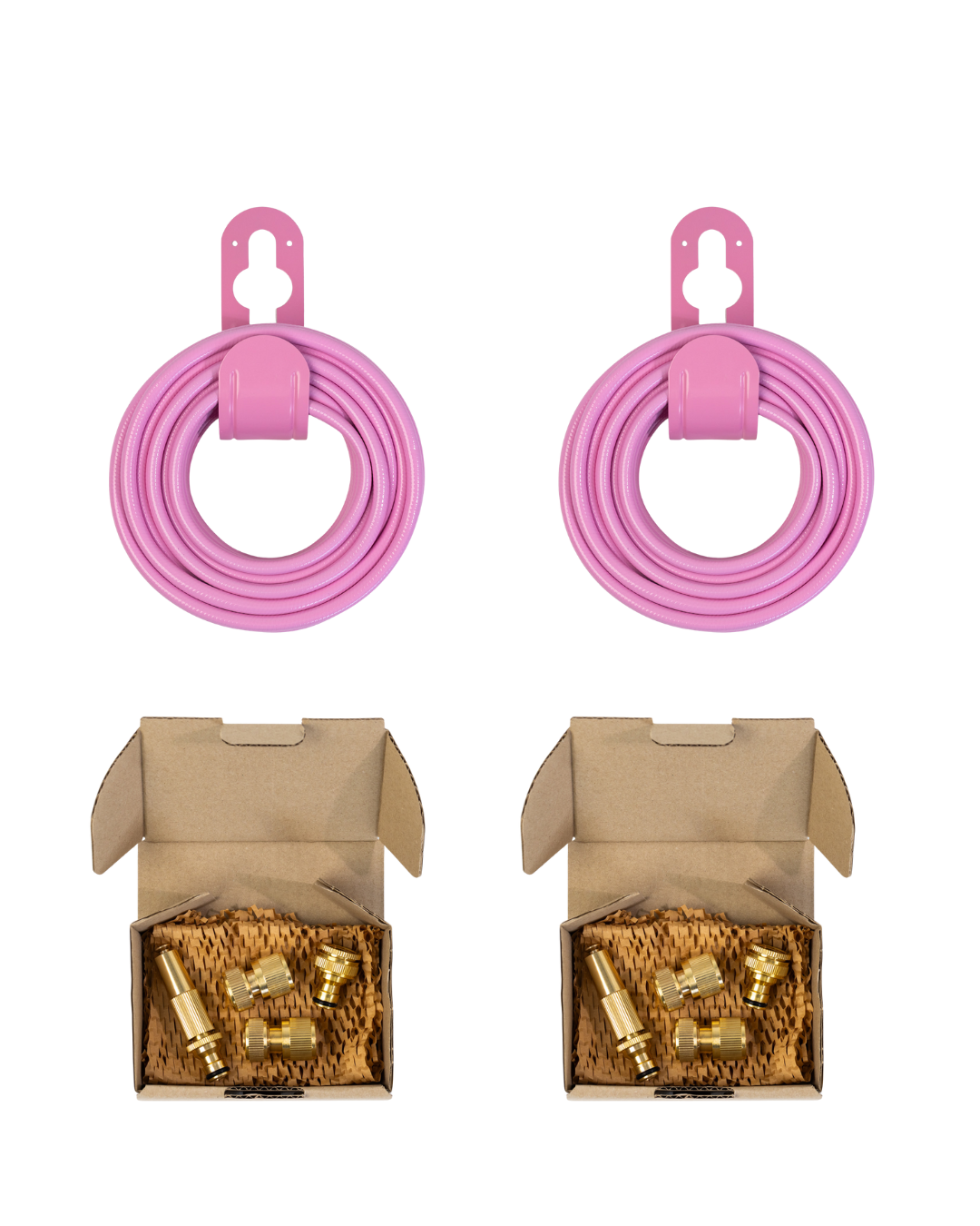 Everything you need to upgrade your garden in one convenient bundle. Our Pink Peony Bundle includes two pink garden hoses, matching metal hangers and two brass attachment sets. This bundle provides everything you need to organise your watering setup.