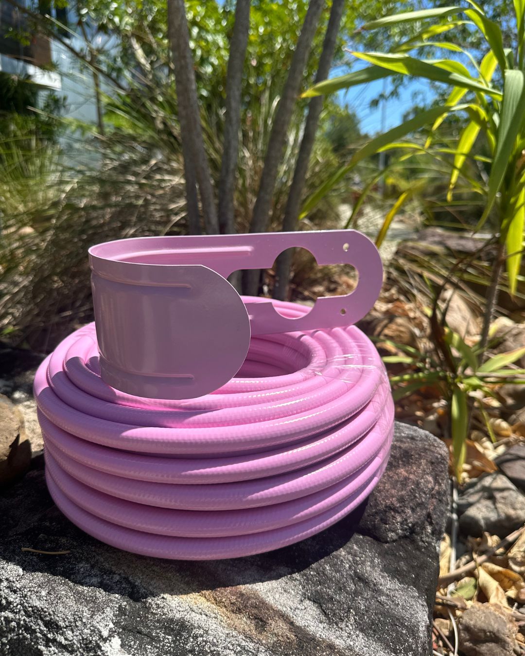 Matching hoses and hangers for a clean garden setup.